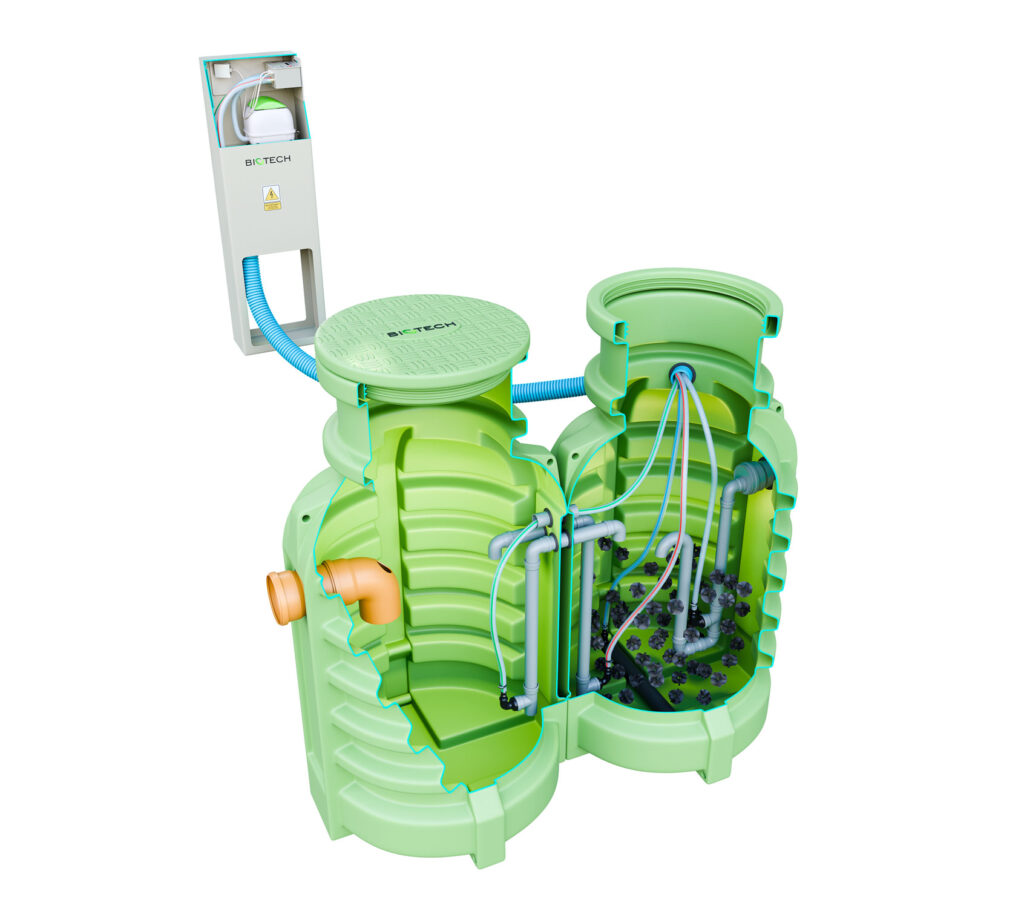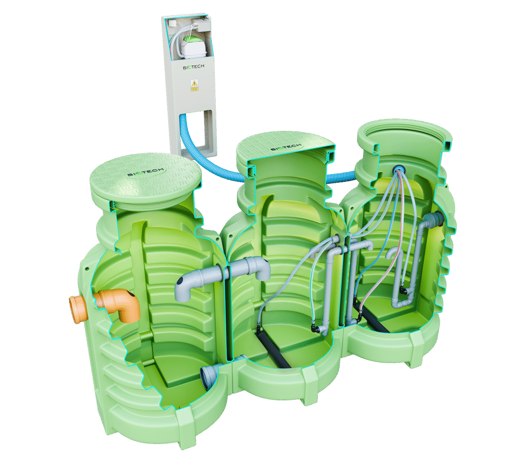 Oczyszczalnie BIOTECH można wyposażyć w pompę zatapialną dzięki czemu zaoszczędzimy na zakupie przepompowni. Daje nam to możliwość swobodnego rozplanowania odbiornika (np. drenaż) do oczyszczalni ścieków.